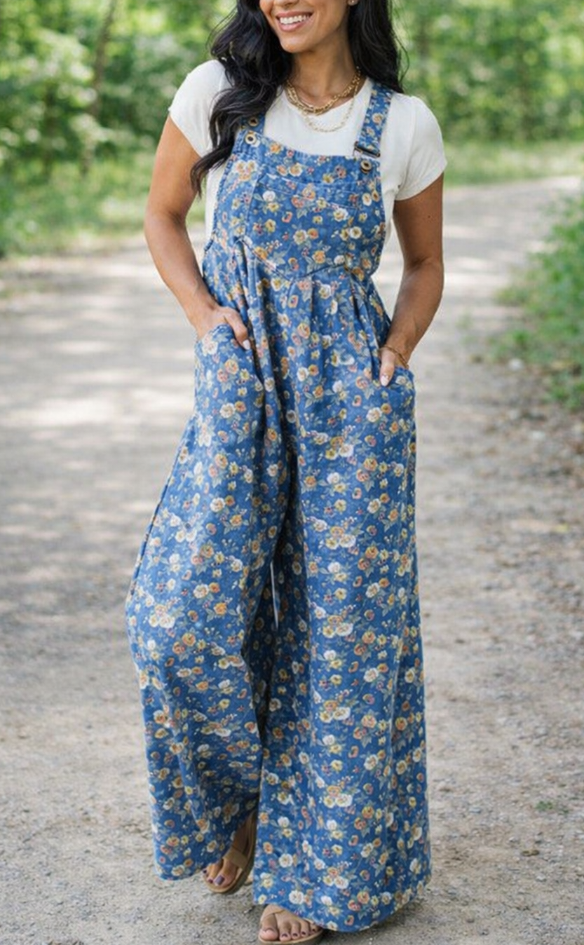 Step into effortless style with our Blue Vintage Overall Jumpsuit, where timeless denim meets charming florals. This piece showcases delicate pleats and all-over vintage floral prints that capture the essence of cozy, relaxed elegance. Layer it over a sheer long sleeve top to elevate the look for seasonal outings or casual days at home. Flattering, comfortable, and versatile—it's the perfect addition to your wardrobe for those moments when you want to feel both put-together and at ease.